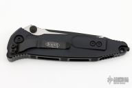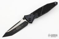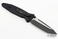 This Socom Elite manual linerlock folder by Microtech Knives has a two-tone black tanto blade with notched thumbrest and dual thumbstuds. Has a black aluminum handle with non-slip inlays, tip down black stainless steel clip and hardware. Serial number 11128 and dated 10/2022. Comes with original box and papers. Excellent condition.