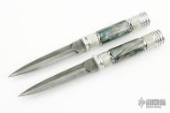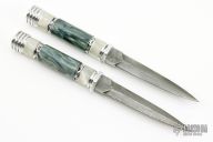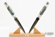 This Set of Daggers by DV Customs features double edged Damascus blades, (1095 and 15N20, 480 layers), .190" blade stock and .850" blade depth, hidden tang construction. The handle is comprised of kirinite and aluminum. Comes with a custom oak stand. New from maker. Comes with a COA