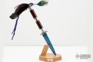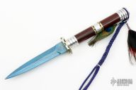 This Dagger by DV Customs features double edged blued Damascus blade, (1095 and 15N20, 480 layers), .209" blade stock and .889" blade depth, hidden tang construction. The handle is comprised of snakewood, brass and aluminum. Comes with a custom oak stand. New from maker. Comes with a COA