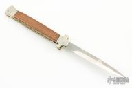This lockback Auto by AGA Campolin has a mirror polished stainless steel spear point blade with false top edge. Handle is wood with mirror polished nickel silver bolsters, brass liners,stainless steel back spacer. Comes with a leather slip sheath and COA. Excellent condition.