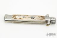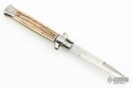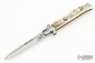 This 9" Swivel Bolster by Stiletto Siciliano features a tumble finished blade. The handle is comprised of stainless steel guard and bolsters with stag scales over brass liners and stainless steel backspacers. Excellent condition.