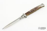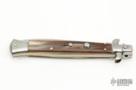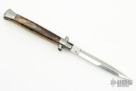 This Swivel Bolster Auto has a stainless steel blade. The handle is composed of a steel front and rear bolsters, brass liners all complemented by buffalo horn scales. Excellent Condition.