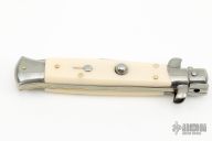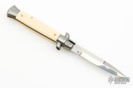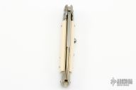 This 9" Picklock by Frank Beltrame features a polished bayonet ground 4mm blade with false top edge. The handle has stainless steel bolsters, front and rear, imitation ivory scales, brass liners, stainless spring. Excellent condition.
