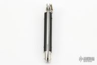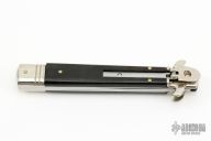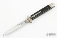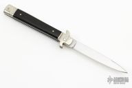 This Leverletto Lever Lock Auto has a mirror polished stainless steel spear point blade. The handle has ebony scales, fluted nickel silver front and rear bolsters, stainless steel liners and back spacer, and nickel silver lock release button. Excellent condition.