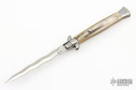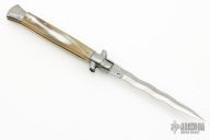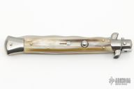 This Swivel Bolster Auto has a stainless steel kris blade. The handle is composed of a steel front and rear bolsters, brass liners all complemented by honey horn scales. Excellent Condition.
