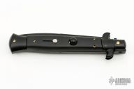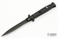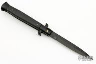This Swivel Bolster Auto has a black blade. The handle is composed of a black steel front and rear bolsters, frame and liners all complemented by non-skid rubber scales. Includes a nylon sheath. Excellent Condition.