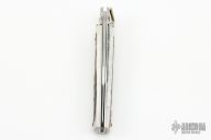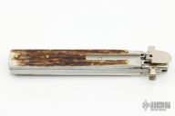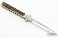 This Leverlock Auto by AGA Campolin has a polished stainless steel spear point blade with false top edge. Handle has stag scales with black liners, nickel silver bolsters, stainless steel liners and backspacer. Has a few light scratches, otherwise excellent condition. Dated 2019