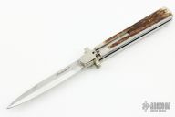 Angelo Campolin Sr. was born in 1923 in Maniago, Italy. He worked on perfecting his knife making skills before WWII and at this time made his first switchblades. After the war, in 1947 he started his company and made 30 stilettos with the marking “Angelo Campolin”. In the 1970’s Angelo’s son Gianni started to work in the company and they were specializing in folding hunting knives and also manual folding stilettos for the Robert Klaas company in Solingen Germany with their Kissing Cranes mark. In 2002 American switchblade collectors Dan Fuller, Brad West, and Tim Zinser were visiting Maniago and enjoying a few glasses of wine in a bar with Angelo Jr. and Gianni. The discussion was about a new name for some knife projects they wanted to pursue. It was Brad West that suggested the tang stamp should be AGA, for Angelo, Gianni, Angelo, thus representing three generations in the knife making business. The Campolins liked it and it stuck. In the beginning it was just a few items, but grew to the point where now there are 12 models and different scale options. The goal has been to offer quality switchblades using the old methods and traditions. Being a collector himself, Angelo Jr. knows what others like. The company headquarters has moved to Austria with production still in the original Maniago shop, as well as the others in Maniago that produce the knives for A.G.A. Campolin.