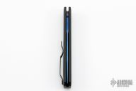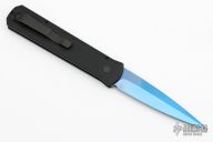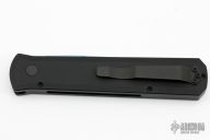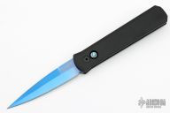 This Godfather by Pro-Tech features a Sapphire blue blade.  The handle has a black aluminum frame with black hardware and black stainless steel tip up clip, abalone inlaid push button.  Comes with soft pouch. Has a couple light scuffs, excellent condition otherwise.