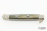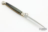 This 9" Sicilian Fighting Knife Ringpull Auto by AGA Campolin features a spear point blade. The handle has nickel silver bolsters, buffalo horn scales, brass liners and stainless steel backspacer. Has a nickel silver ring pull. Has a couple light scratches, otherwise excellent condition.