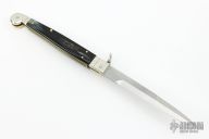 This 12" Sicilian Fighting Knife Ringpull Auto by AGA Campolin features a spear point blade. The handle has nickel silver bolsters, buffalo horn scales, brass liners and stainless steel backspacer. Has a nickel silver ring pull. Has a couple light scratches, otherwise excellent condition.