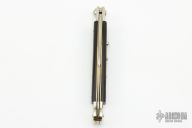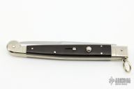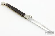 This 12" Sicilian Fighting Knife Ringpull Auto by AGA Campolin features a spear point blade. The handle has nickel silver bolsters, ebony wood scales, brass liners and stainless steel backspacer. Has a nickel silver ring pull. Has a couple light scratches, otherwise excellent condition.