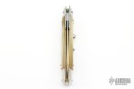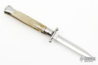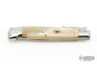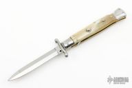 This 9" Swinguard Auto has a mirror polished stainless steel spear point blade with false top edge. Handle has honey horn scales with stainless steel bolsters and pommel, brass liners, brass pins, stainless steel backspacer, and a safety. Has a couple light scratches, otherwise excellent condition.