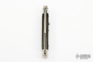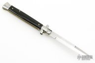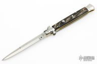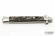 This 11" Picklock features a tumbled blade with false top edge. The handle has stainless steel bolsters, front and rear, buffalo horn scales, brass liners, stainless spring. Has a few light scratches, otherwise excellent condition.