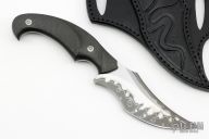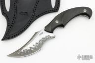 This Snake from the Sobral Brothers features their San Mai steel that has been forged into a beautiful finished product. Has a clip point recurve blade with a false top edge, .157" blade stock and 1.574" blade depth, full tapered tang construction. The handle features carbon fiber scales with stainless steel pins that have been laser engraved. Comes with a hand tooled black leather sheath and a leather zippered case. New from maker.