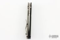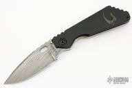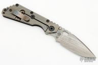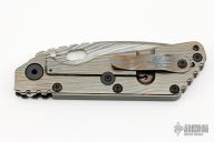This SMF by Mick Strider features a laser engraved blade with thumbhole and notched thumbrest. The handle has laser engraved black aluminum and titanium frame and tip up titanium clip, has black hardware and an anodized titanium lockbar stabilizer. Notches on thumbrest, rear of handle. Nice detent, blade seating and lockup. New condition.