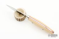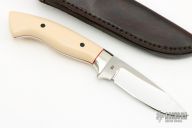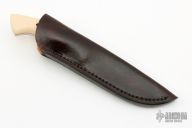 This custom fixed blade from Rick Menefee features a mirror finished blade with .119" blade stock and .973" blade depth, full tang construction. The handle has nickel silver bolsters, ivory paper micarta scales with red liners and black linen micarta pins. Comes in a custom brown leather belt sheath made by Rick Menefee. Excellent condition.