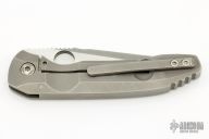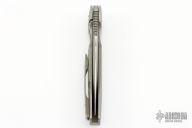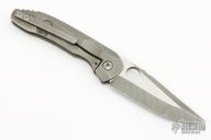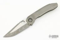 This Small Nirvana folder by Peter Rassenti features a San Mai Damascus blade with thumbhole and notched thumbrest. The handle has an integral tumbled titanium frame with a zirconium pivot collar,  titanium clip, tip up carry. Nice detent, lockup and blade seating. Comes with original box. Has a few light scratches, otherwise excellent condition.