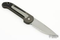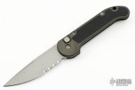 This LUDT side opening automatic by Microtech Knives has a bead blast finished partially serrated blade. The handle has a black anodized aluminum frame with rubber inserts, missing the tip down stainless steel clip. Comes with original box and papers. Dated 1/98. New old stock condition.