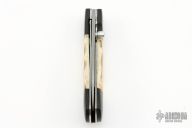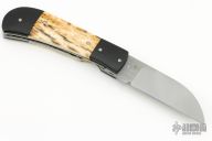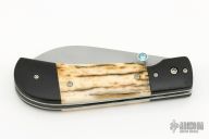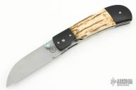 This knife by Jake Elenbaas features a bead blast finished 8670 Steel blade with single thumbstud with blue stone inlay. The handle has black G-10 bolsters, front and rear, mammoth ivory scales, stainless steel liners with jeweled interiors and a black G-10 backspacer. Nice detent, lockup and blade seating. Comes with COA. New from maker.
