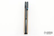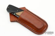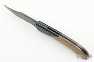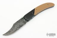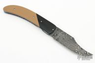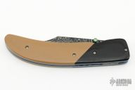 This knife by Jake Elenbaas features a clip point Alabama Damascus blade with single thumbstud with yellow stone inlay. The handle has black G-10 bolsters, brown G-10 scales, anodized titanium liners with jeweled interiors and a black G-10 backspacer. Nice detent, lockup and blade seating. Comes with a brown leather sheath and COA. New from maker.