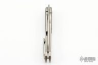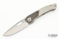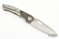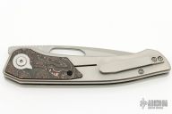 The Ari by Caelum Blade Designs features a stonewashed blade with thumbhole and notched thumbrest. The handle has a bead blasted titanium frame with copper carbon fiber inlaid bolsters, tip up titanium clip, left or right reversible. Coems with original box, zippered case and papers. New condition.