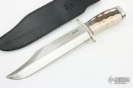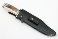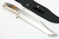 This Model 12-11 Smithsonian Bowie by Randall Made Knives features a satin finished carbon steel blade with sharpened top edge, .330" blade stock and 2.200" blade depth, hidden tang construction. The handle has a forward curved nickel silver guard and butt, fossil walrus ivory grip with black/duralumin spacers. Comes with original black leather sheath. Excellent condition. Made in 2010