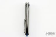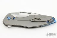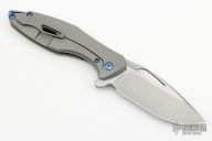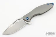 This Arius by Koenig knives features a bead blast finished blade with thumbhole and flipper. The handle has a blast finished milled titanium frame with matching tip up clip and titanium backspacer. Has ceramic bearings and a ceramic detent ball. Nice detent, lockup and blade seating. Comes with COA dated March 15, 2022 and original box. Excellent condition.