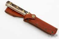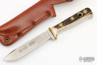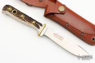 This Outdoor by Puma Knives features a satin finished blade with notched spine and false top edge, .232" blade stock and .998" blade depth, full tang construction. the handle has a brass guard with stag scales. Includes a leather sheath. Excellent Condition. Comes with Puma box and papers.