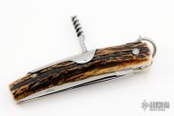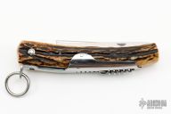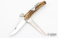This ringlock by JM INOX FRANCE features a mirror polished blade with nail nick, saw blade with nail nick, and a corkscrew on the spine with nail nick. The handle is a single piece of stag with steel ringlock mechanism on the spine. Comes with a zippered case. Excellent condition.