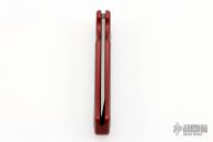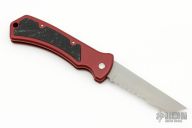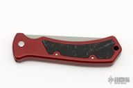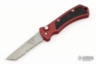 This Side-opening coil spring automatic by Paragon features a bead blast chisel ground tanto blade with partially serrated edge. Red aluminum frame with rubber inlays. Has soem light scuffs, otherwise good condition. Comes with a nylon belt sheath.