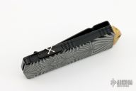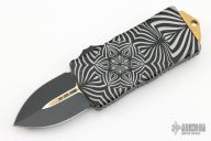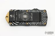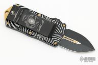 This Microtech Exocet features a two-tone black double edged blade with gold accented fullers. The handle has a "Source" artwork aluminum handle and a black finished stainless clip that doubles as a money clip dated 12/2021 s/n 117. Comes with original box and papers. Excellent condition.