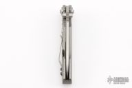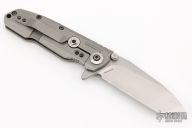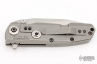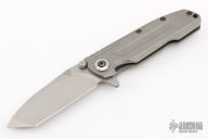 This Frame lock Flipper has a stonewashed S35VN tanto blade with dual thumb studs, flipper, and filed thumb rest. Handle is stonewashed and anodized titanium with stainless steel lock bar insert, manual lock safe system (preventing the lock bar from sliding to the open position, making this knife a virtual fixed blade), stonewashed titanium backspacer and tip up clip, and lanyard hole. This is an impressive piece with superb ergonomics and mechanics. Flips like a champ on caged bearings, dead center blade seating and rock solid lockup. Very nice work. Excellent condition. Comes with zippered case. #045