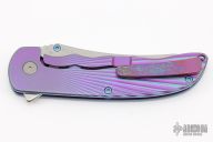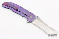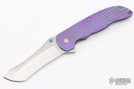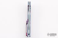 This Norseman (#3808) by John Grimsmo features a tumbled blade with a dual anodized titanium thumbstuds, notched thumb ramp and flipper. Anodized finished and Starburst 2.0 textured titanium frame with anodized titanium screws. Very smooth action that requires no wrist movement. Nice detent, lockup and blade seating. Rides on ceramic bearings. Knife is in excellent condition, shows no signs of use or carry. Comes with original packaging, custom hard case, Nano-Oil and tool. COA dated July 24, 2020.