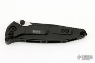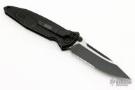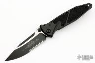 This Socom Elite from Microtech has a black/satin partially serrated blade with dual thumbstuds and notched thumbrest. The handle has a black aluminum frame with non-slip rubber inserts and a tip down stainless steel clip, black hardware. Dated 08/2022 and S/N 10552. Includes original box and paperwork. Excellent condition.