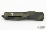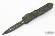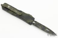 This UTX-85 OTF automatic by Microtech knives features a D/E olive camo double edged blade with a fully serrated edge, and an olive camo aluminum handle with green hardware, tip down carry. Glass breaker. S/N 006. Dated 09/2022. Comes with original box and papers. New condition.