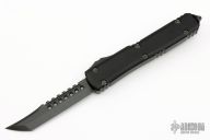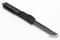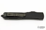 This Ultratech Hellhound by Microtech Knives features a black stonewash DLC blade with notched thumbrest and fullers, false top edge. The handle has a black aluminum frame with tip down black stainless steel clip, black DLC hardware, black titanium thumbslide. Comes with original box and papers. Excellent condition. Dated 08/2022 and s/n 644