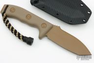 This Currahee by Microtech has a tan tanto blade with a standard edge and tan polymer scales. 3/16" blade stock and 1 1/2" blade depth, full tang construction. Dated 06/2022 and S/N 5160. Comes with kydex sheath with molle lock and original box. Excellent condition.