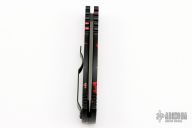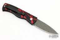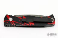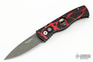 This TR-2 by Pro-Tech Knives has a Devin Thomas Rain Drop Damascus blade and a custom P.K. splash anodized handle inlaid with a sterling silver skull designed by Bruce Shaw. Pearl inlaid push button. Black stainless steel clip. Comes with original box and sheath. Excellent condition.