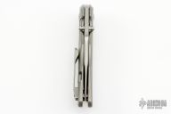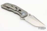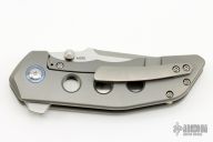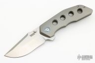 This X-Series knife from Enrique Pena/Reate Knives feature a M390 blade with a false top edge and notched flipper. The handle has a tumbled and anodized titanium frame with hole pattern and a matching tip up clip. Nice detent, lockup and blade seating. Includes a Pena X-Series padded box. Excellent condition.