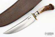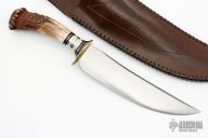 This Fighter by Jim Behring features a satin finished convex ground blade with .235" blade stock and 1.924" blade depth, hidden tang construction. The handle has a brass guard, spacer pattern consisting of black/aluminum/ivory paper micarta/brass, crown stag grip with a brass pin. Comes with a hand tooled brown leather sheath by Roger "Mudbone" Jones. Excellent condition.