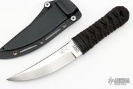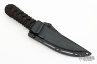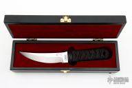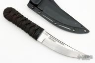 This Sakimori from CRKT is a James Williams Design. It features an upswept blade with polished flats, satin grinds and swedge. The handle is comprised of a detailed polymer guard with paracord wrap over faux rayskin and hidden tang construction. Includes a kydex sheath with belt loop and wood presentation box. Excellent condition.