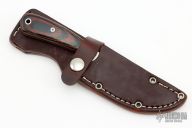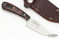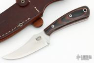 This Fingerling by Bark River Knives features a satin finished blade with .122" blade stock and 1.043" blade depth, full tang construction. The handle has black/red linen micarta scales with lanyard hole. Comes with a brown leather sheath and original box. Excellent condition.