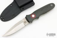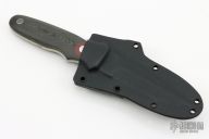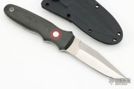 This KM-6 Arkansas Toothpick by Dozier knives features a satin finished blade with a false top edge, .171" blade stock and .918" blade depth, full tang construction. The handle has black linen micarta scales with red linen micarta insert and aluminum pins and lanyard hole. Comes with a kydex sheath. Excellent condition.