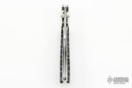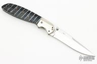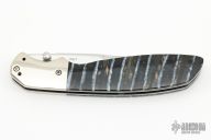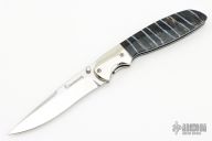 This knife by Browning features a mirror polished blade with notched thumbrest and dual thumbstuds. The handle has nickel silver bolsters, blue mammoth tooth scales, stainless steel liners. Comes with original box and papers. Excellent condition.