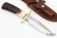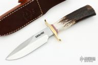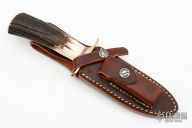 This Combat Companion by Randall Made Knives features a satin finished blade with .214" blade stock and 1.228" blade depth, 3" sharpened top edge, hidden tang construction. The handle is comprised of a brass double guard, red/white/blue spacers, stag grip. Includes a brown leather sheath and original paper wrapping. New condition.