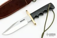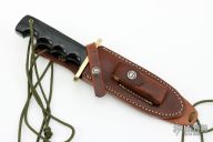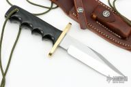 This Model 15 Airman by Randall Made Knives features a clip point blade with a sharpened top edge, .217" stock. 1.258" blade depth, full tang construction. The handle has black linen micarta handle with finger grips and a brass guard. The Model 15 is designed especially for heavy-duty use and to be as nearly indestructible as possible. Comes with a brown leather sheath. New condition. Comes with original paper wrapping.