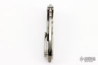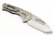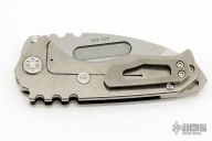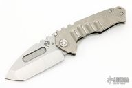 This Praetorian Genesis T by Medford Knife and Tool features a tumbled tanto blade with fullers and notched thumbrest. The handle has a tumbled titanium frame with a titanium tip up pocket clip and a D2 backspacer/glass breaker with lanyard bail.  Includes vault style case and original papers dated June 27, 2022. Excellent condition.