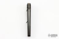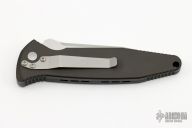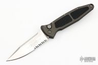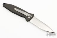This Mini Socom Auto by Microtech Knives features a hand rub satin finished clip point blade with partial serrations, swedge and notched thumbrest. Black aluminum frame with nonslip inserts, tip down bead blasted stainless steel clip. Nice lock up and blade seating. Comes with original box, papers and sheath. The satin finish was done by G. Brend, Walter Breden's daughter.  Excellent condition.