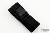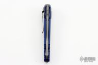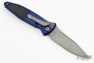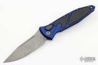This Socom Elite Auto has an apocalyptic finished clip point blade with a standard edge. Blue aluminum handle with custom Blackwood carbon fiber inserts, custom Dragonskin Damascus tip down clip. Glass breaker. Dated 12/2020 and s/n 5767. Has scuffs and scratches, has been used, otherwise good condition. Comes with nylon belt sheath.